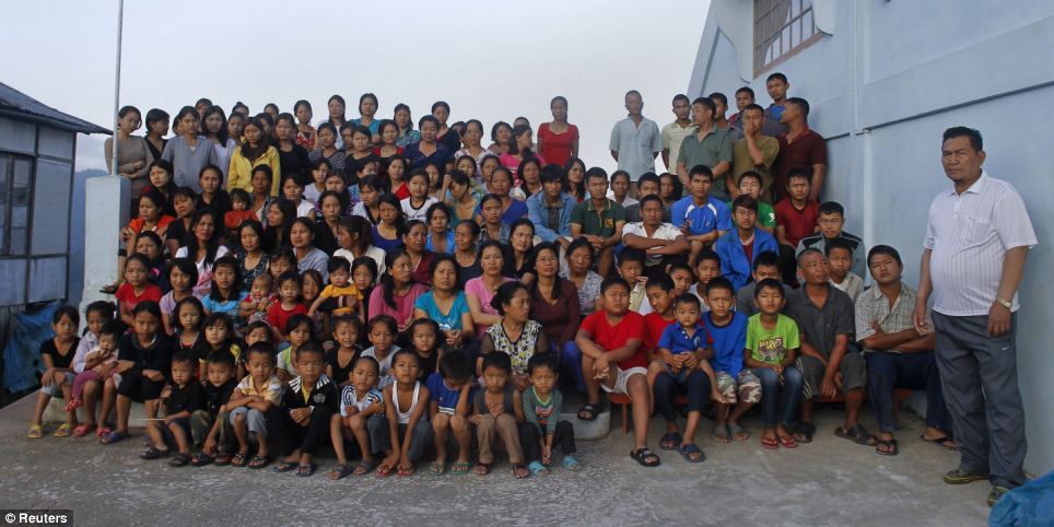 Ziona Chana, 67, has 39 wives, 94 children, 14 daughters-in-law and 33 grandchildren living under the same roof, in a house of 100 rooms.