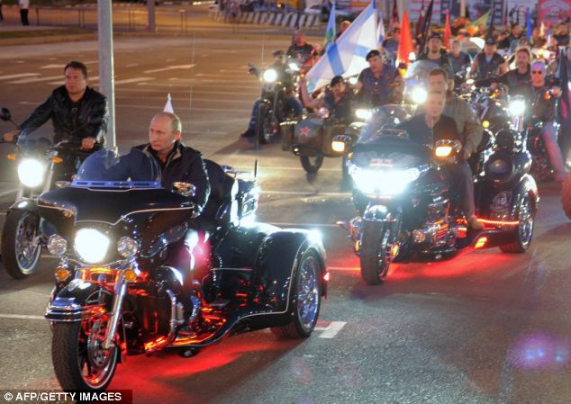 Vladimir Putin, 58, was riding a three-wheeled Harley Davidson and looking very much at home in the latest of macho stunts that have punctuated his political career.
