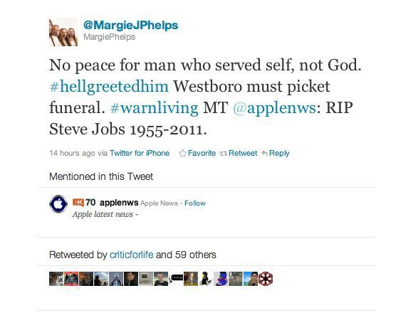 Westboro Baptist Church in Topeka, Kansas, announced its plans to protest Steve Jobs’ funeral, sending the message out via Twitter for iPhone.