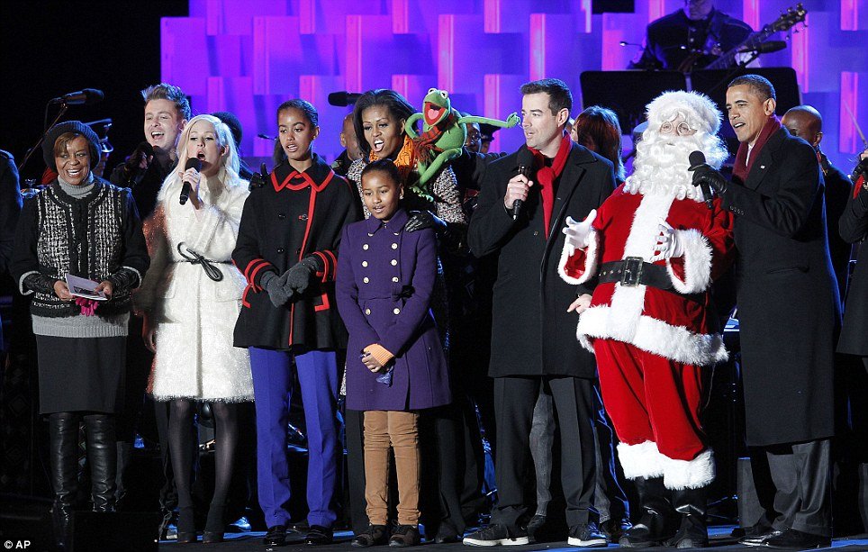 President Barack Obama, First Lady Michelle Obama, and their daughters Sasha and Malia took the stage next to Santa Claus and Kermit the Frog and officially marked the start of the Christmas season with some carolling before they flipped the switch.