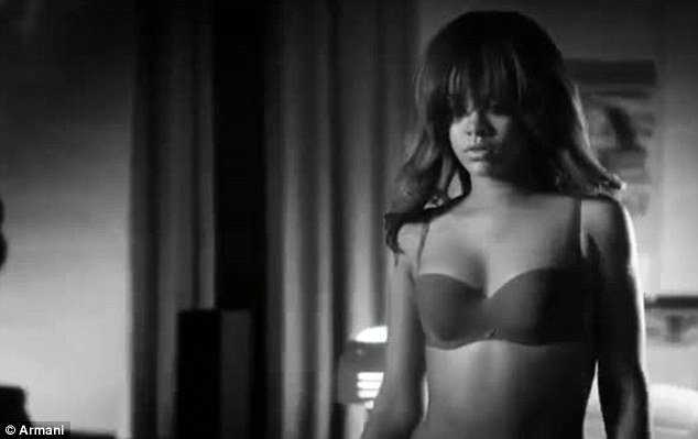 The advert shows Rihanna laying in a large double bed on her own wearing black lace underwear as she appears to have a nightmare.