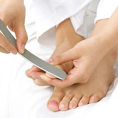 File nails straight across. While it’s trendy to go for fancy shapes on your fingers, Margaret Dabbs says feet should never be filed in a round shape like fingernails.