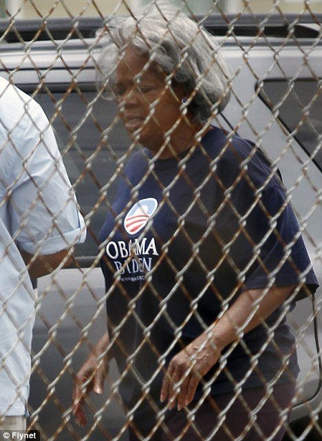 The media mogul wore a short gray wig, a blue Obama T-Shirt and baggy jeans.