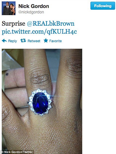 Nick Gordon, 22, tweeted a picture of 19-year-old Bobbi Kristina Brown wearing the giant sapphire stone surrounded by diamonds yesterday, sparking rumors of an engagement.