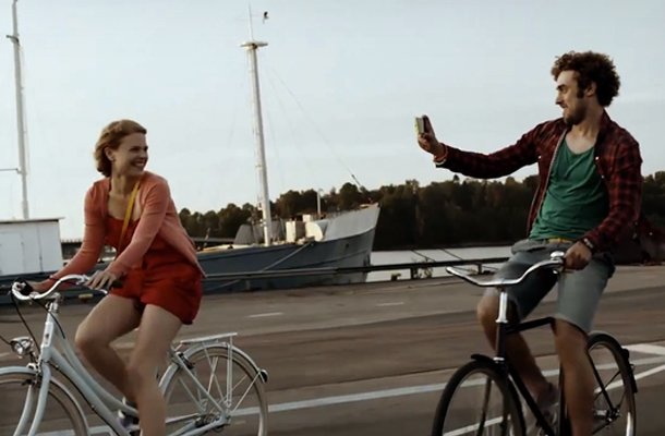 The advert showed a man filming his girlfriend using the new smartphone while both of them were riding bicycles.