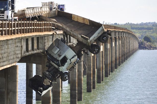 A lorry driver in southern Brazil had a miraculous escape when his vehicle skidded over the guard rail as he crossed Chavantes bridge linking the states of Sao Paulo and Parana.