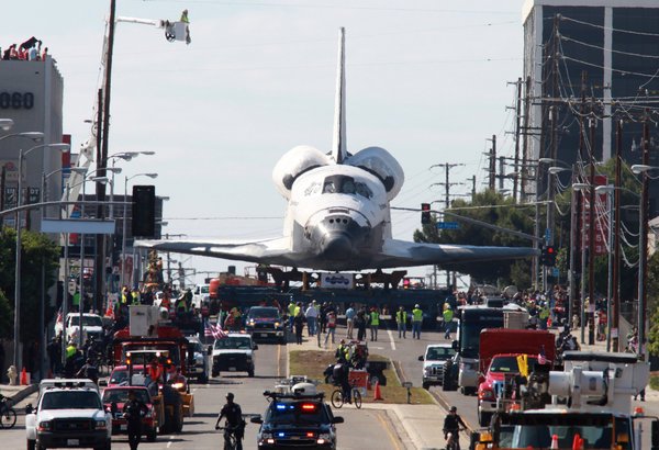 For its trip across Los Angeles, Endeavour has been placed on a 160-wheeled carrier which is being guided by remote control.