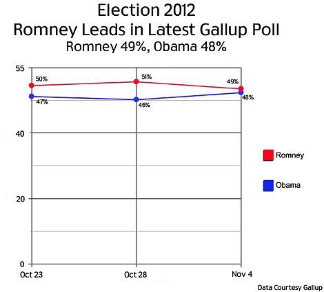 Polls by Gallup and Rasmussen both gave Mitt Romney 49% of the national vote, ahead of Barack Obama on 48%, flying in the face of other polls which had appeared to show the President in the driving seat over the weekend.