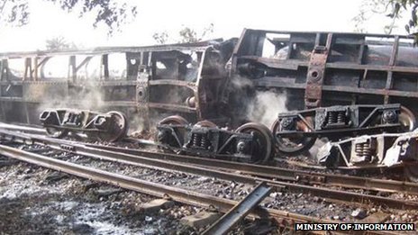 Burma’s information ministry said locals had been attempting to collect the spilled fuel. It posted images on its website of burnt out carriages and what appeared to be charred bodies.