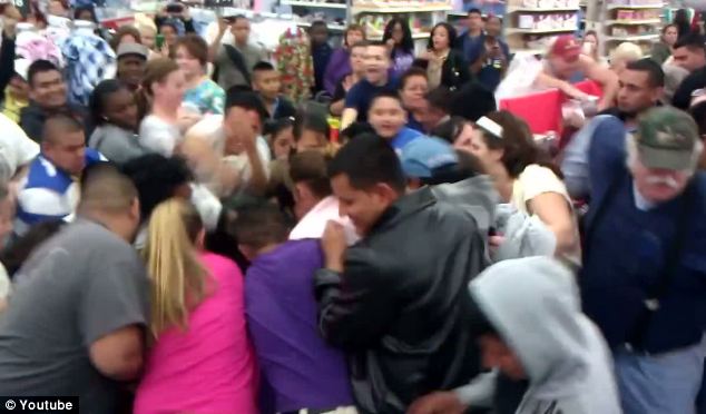 In one Walmart, the fights were underway within minutes of opening – as captured on a video posted to YouTube by a father who brought his two children along to the sales.