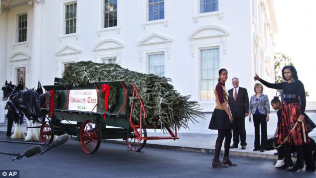 Michelle Obama’s daughters, Malia and Sasha, and the first dog Bo were also in attendance for the presentation of the giant tree, which arrived on a horse-drawn carriage on Friday morning.