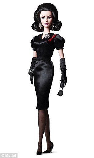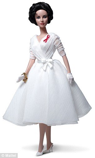 Along with her signature black bob, the White Diamonds, $125, doll stands clad in a glamorous white dress with a red satin ribbon pinned on the lapel to represent the extensive work Elizabeth Taylor did for HIV and AIDS.