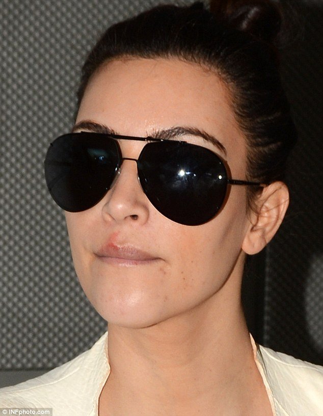 Tired looking Kim Kardashian revealed a painful-looking large sore on her upper lip, along with blemishes on her chin as she flew into Miami on Sunday.
