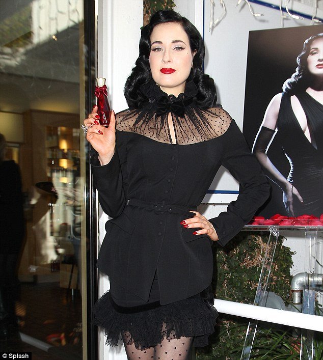 Dita Von Teese’s raven hair was side-parted with big barrel curls and she sported the usual cat-eye make-up and scarlet lips on her pale complexion.