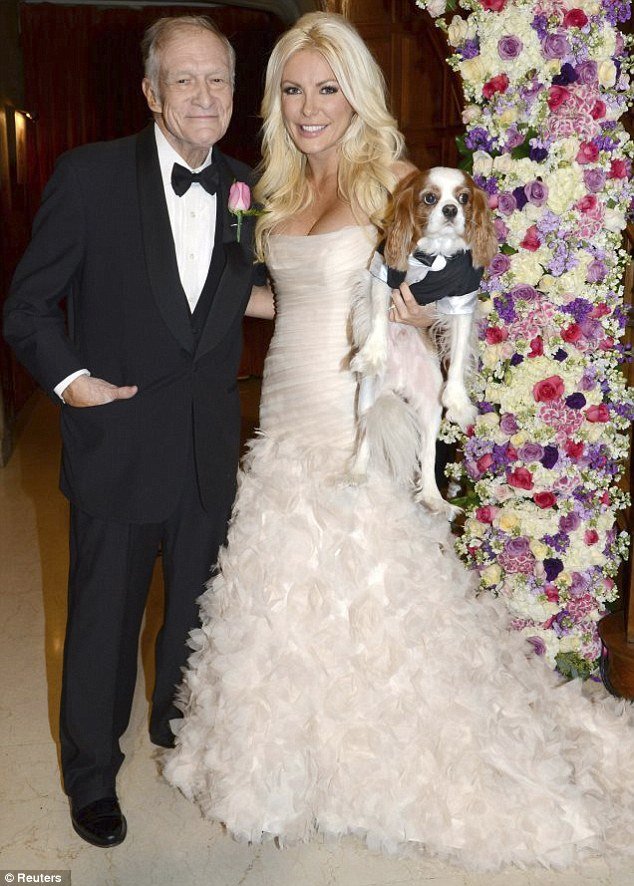 The newlyweds smile for the camera as they pose up underneath a floral archway, with Crystal Harris keeping a tight hold on Hugh Hefner’s dog Charlie, who was dressed in a cute tuxedo for the occasion.