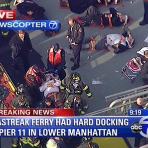 New York Seastreak Wall Street ferry has hit a dock during the Manhattan rush hour, injuring as many as 57 people and tearing a hole in the vessel’s bow.