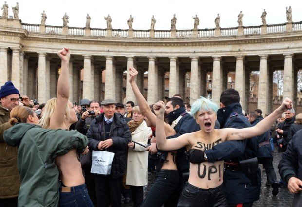 Three activists of the Ukrainian women’s rights movement Femen staged a protest at the Vatican on Sunday, shortly after the Pope’s regular Sunday address.