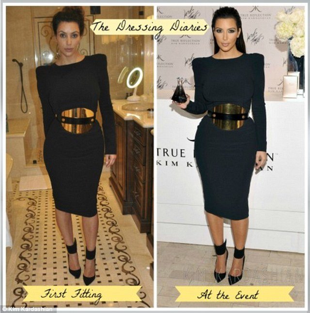 The two images show what a difference Kim Kardashian’s hair and make-up makes to the finished look.