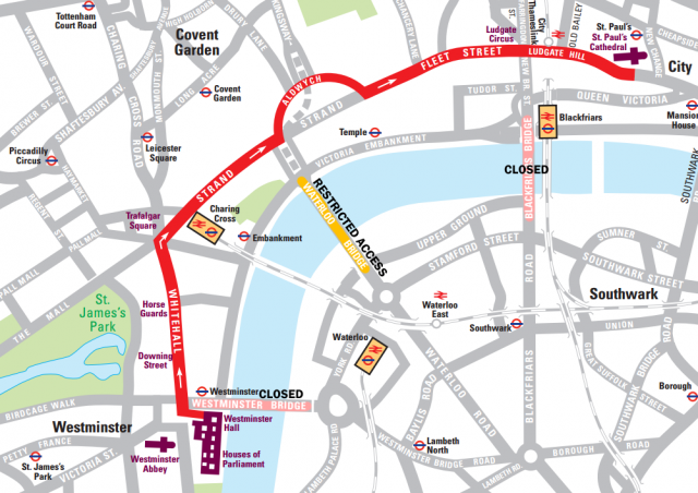 Note that Westminster Bridge and Blackfriars Bridge are not on the route, but will both be closed, while Waterloo Bridge will be subject to “restricted access”.