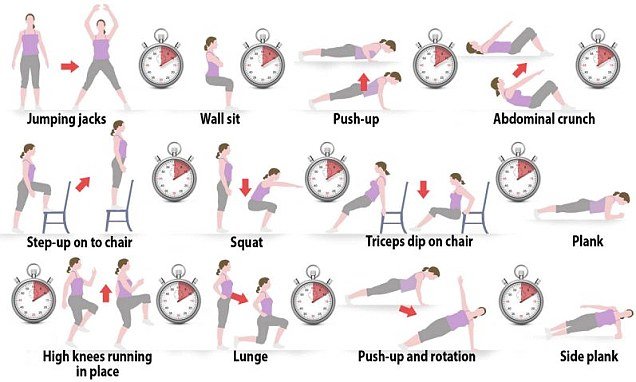 The program includes 12 exercises that use the body’s own weight to get the same amount of exercise as doing a long run and session of weight-training in just seven minutes.