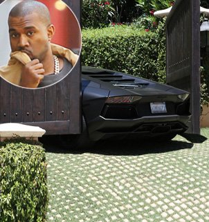 Just days after his stumble into a New York street sign was caught on camera, Kanye West’s stunning $750,000 Lamborghini has been crushed after getting trapped in Kim Kardashian’s electric gates.