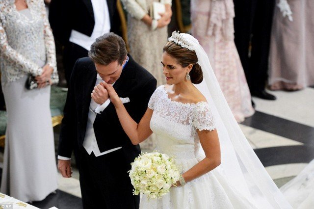 “Party princess”, 30, the youngest of King Carl XVI Gustaf and Queen Silvia’s three children, married British-born financier Chris O’Neill, 38, in Stockholm’s Royal Palace today wearing a breathtaking Valentino wedding gown.