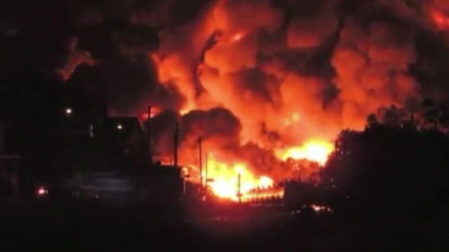 The train had 70 cars filled with petroleum products, some of which exploded, prompting fires in nearby homes.