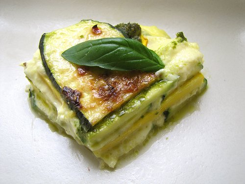 - Select a baking tray with shallow sides and grease it lightly. Alternatively, you can use a greased loaf tin measuring about 22cm x 12cm x 6cm (8½ in x 4¾ in x 2½ in). Have the blanched green vegetables ready. Using a mandoline or swivel vegetable peeler, thinly slice the courgette lengthways into even ribbons. Squeeze off excess water from the spinach. Beat the spinach with the cheese, crème fraîche, garlic, nutmeg and seasoning.
