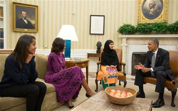 Pakistani schoolgirl campaigner Malala Yousafzai has met President Barack Obama and First Lady Michelle Obama at the White House in the Oval Office.