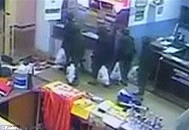 In one section of footage, several soldiers are seen walking out of the supermarket, past a blood-spattered floor, carrying plastic carrier bags.