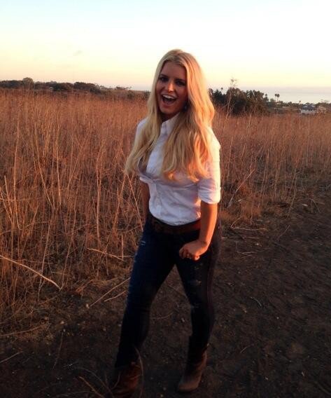 Jessica Simpson, 33, is seen wearing dark jeans, boots and a tight-fitting white button down top while standing in a field. The singer and designer smiled with her mouth wide open, and with her beautiful blonde locks down in waves.