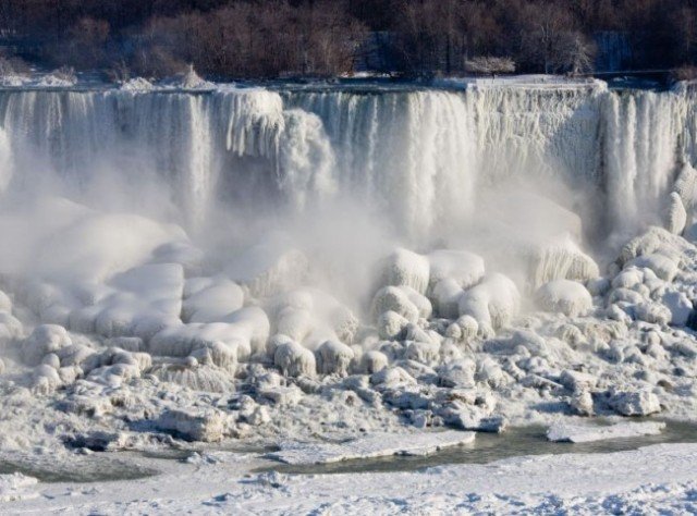 Niagara Falls hasn’t frozen over, but it has become an icy spectacle, thanks to a blast of arctic wind and cold that blew around and froze the mist on surfaces and landscaping.
