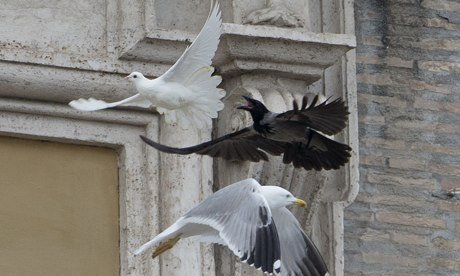 The birds swept down on the doves after they were set free from the Apostolic Palace during the Pope’s weekly Angelus prayer.