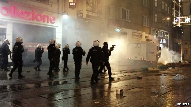 Demonstrators threw fireworks and stones at police cordoning off Taksim Square, the city’s main square.
