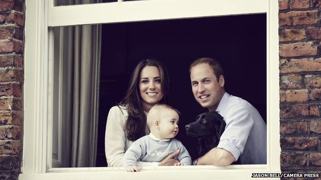 The eight-month-old is pictured in Kate Middleton’s arms while Prince William holds their dog, Lupo.