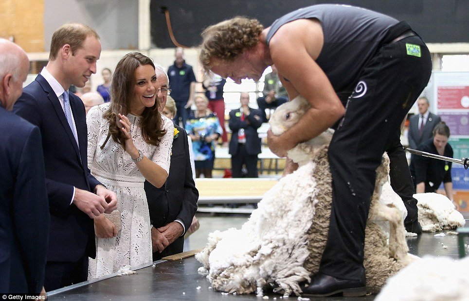Prince William and Kate Middleton watched a shearing demonstration, and the Duchess of Cambridge seized the opportunity to poke fun at her husband’s bald spot. Lyn Crejan, a farmer from Glenn Innes in New South Wales, showed them a tuft of alpaca wool that just so happened to be a similar shade to Prince William’s hair.