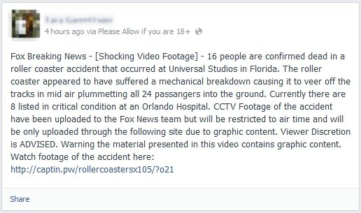 The post says: “Fox Breaking News – [Shocking Video Footage] – 16 people are confirmed dead in a roller coaster accident that occurred at Universal Studios in Florida. The roller coaster appeared to have suffered a mechanical breakdown causing it to veer off the tracks in mid air plummetting all 24 passangers into the ground.”