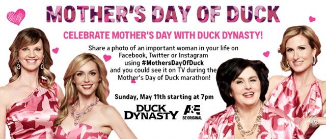 Duck Dynasty cast wrote on their Facebook page: “Tweet, Instagram or upload a photo of you and your mom with #MothersDayofDuck for your chance to see your image on TV this #MothersDay! #DuckDynasty www.bit.ly/1k4lp4S“