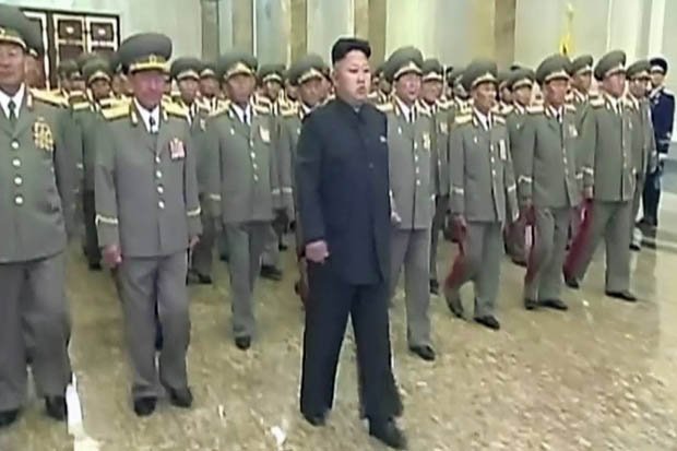 The rare footage, aired by North Korea’s state TV, shows Kim Jong-Un walking into the mausoleum with a limp and bowed deeply in front of statues of his grandfather Kim Il-sung and his father Kim Jong-il.