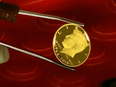 The gold proof coins being made at West Point with three-quarter ounces of 24-karat gold will begin going on sale August 5 at the World’s Fair of Money in Rosemont, Illinois. That coin will be dated 1964-2014 and its price will be around $1,300, depending on the market price of gold.