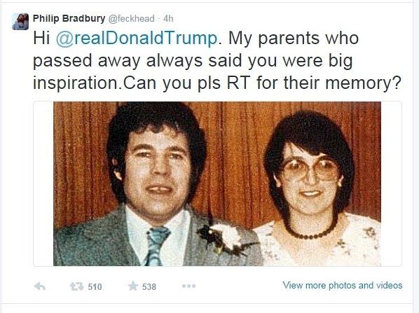Addressing the incident, Donald Trump later tweeted: “Some jerk fraudulently tweeted that his parents said I was a big inspiration to them + pls RT-out of kindness I retweeted. Maybe I’ll sue.