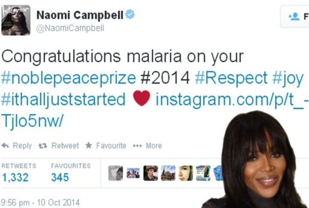 Naomi Campbell, 44, appeared to fall foul of autocorrect, spelling the Pakistani teenager’s name “malaria” and drawing an instant chorus of dismay from eagle-eyed Twitter users.