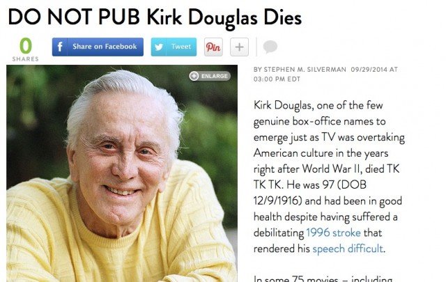 It read: “Kirk Douglas, one of the few genuine box-office names to emerge just as TV was overtaking American culture in the years right after World War II, died TK TK TK. He was 97 (DOB 12/9/1916) and had been in good health despite having suffered a debilitating 1996 stroke that rendered his speech difficult.”