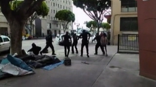 The footage shows a violent struggle between the man and several officers in the city’s Skid Row area.