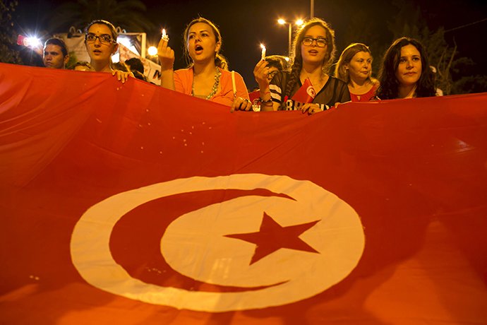 The demonstrators marched after dark on the streets of Sousse, with many holding candles to mourn the victims of Friday’s attack.
