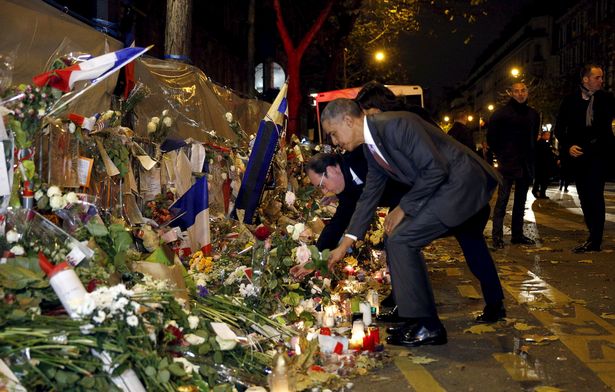 Accompanied by President Francois Hollande and Paris Mayor Anne Hidalgo, Barack Obama laid a single white rose at the venue where 90 people were killed.
