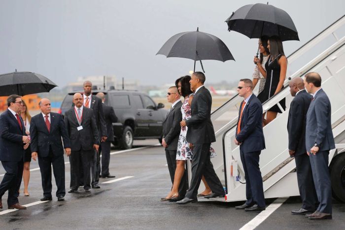 Holding umbrellas, the party walked in light drizzle along a red carpet to be greeted by Cuban Foreign Minister Bruno Rodriguez.