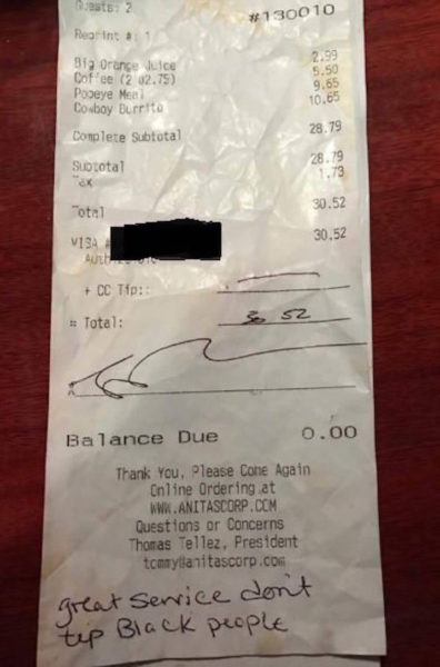 Kelly Carter said a couple had written on the receipt: “Great service don’t tip black people.”