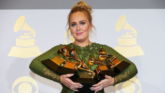 Adele was the big winner at the 59th Grammy Awards on February 12, taking home five trophies.