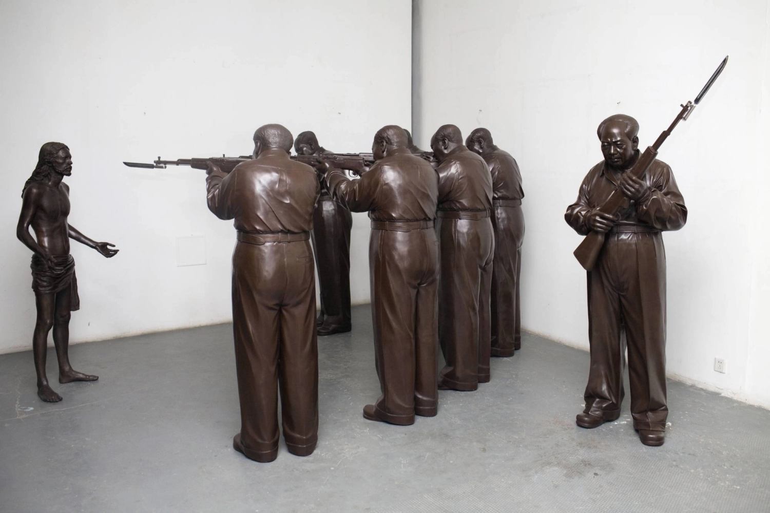 - “The Execution of Christ”: A surrealist scene featuring multiple figures of Mao aiming rifles at a kneeling Jesus.